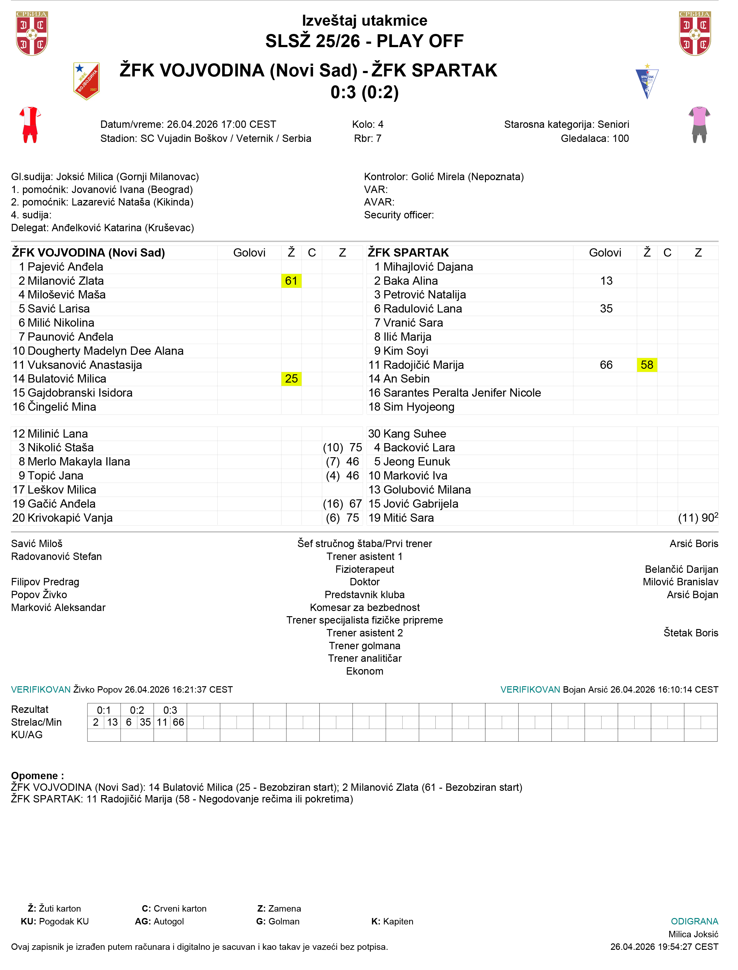 Spartak je pobedio Vojvodinu ubedljivim rezultatom 0:3 u 4.kolu plej-ofa Super lige Srbije za žene. Golubice su delovale dominantno i sigurno, kontrolisale utakmicu i dobrom igrom stigle do veoma važne pobede koja nas je približila na korak od Evrope.